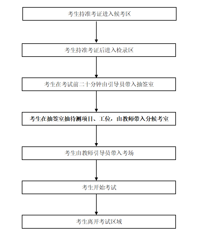 2.请所有考生按准考证上的考试时间提前30分钟进入候考区。以考生进入抽签室的时间节点为界,凡迟到15分钟及以上的考生不得参加该场考试。