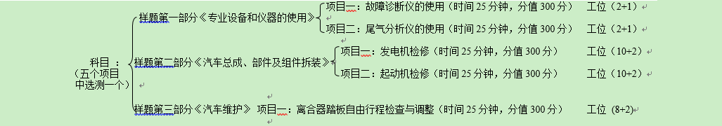 考生从样题第一部分《专业设备和仪器的使用》(两个项目)、第二部分《汽车总成、部件及组件拆装》(两个项目)、第三部分《汽车维护》(一个项目)中随机抽取一项考试。