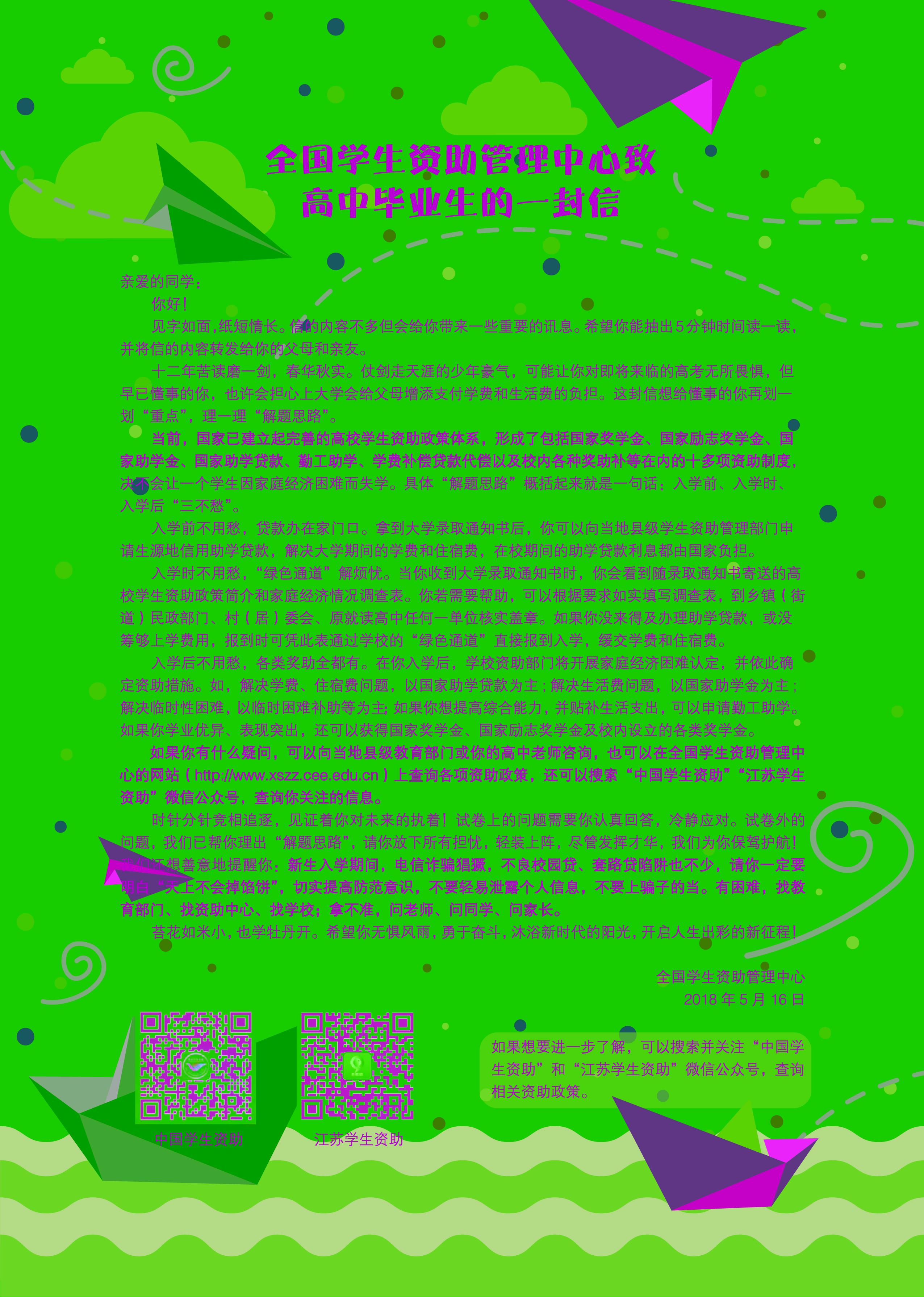 如果你有什么疑问,可以向当地县级教育部门或你的高中老师咨询,也可以在全国学生资助管理中心的网站(http://www.xszz.cee.edu.cn)上查询各项资助政策,还可以搜索“中国学生资助”“江苏学生资助”微信公众号,查询你关注的信息。