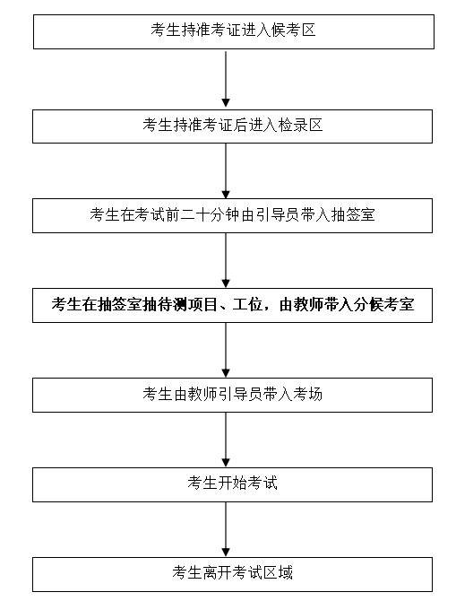 2.请所有考生按准考证上的考试时间提前30分钟进入候考区。以考生进入抽签室的时间节点为界,凡迟到15分钟及以上的考生不得参加该场考试。